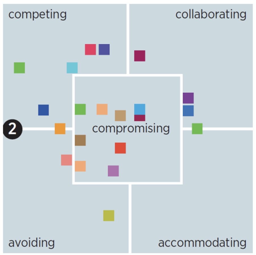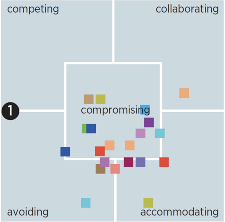 แนวทางทั้ง 5 นี้มีทั้งข้อดีและข้อเสีย หากฝึกฝนไม่ดี แต่ละคนย่อมมีสไตล์ที่ตนเองถนัดและมักใช้วิธีการแบบนั้นกับทุกสถานการณ์ที่มีความขัดแย้งเกิดขึ้น ผลการสำรวจพบว่าผู้บริหารระดับสูงทั้งหมดขององค์กรนี้ มีสไตล์การจัดการกับความขัดแย้งกระจุกตัวอยู่ที่ Compromising, Avoiding และ Accommodating (ภาพที่1)  ซึ่งทำให้เข้าใจได้ว่าเหตุใดที่ผ่านมาพวกเขาจึงมีพฤติกรรมตามที่เล่าไปข้างต้น