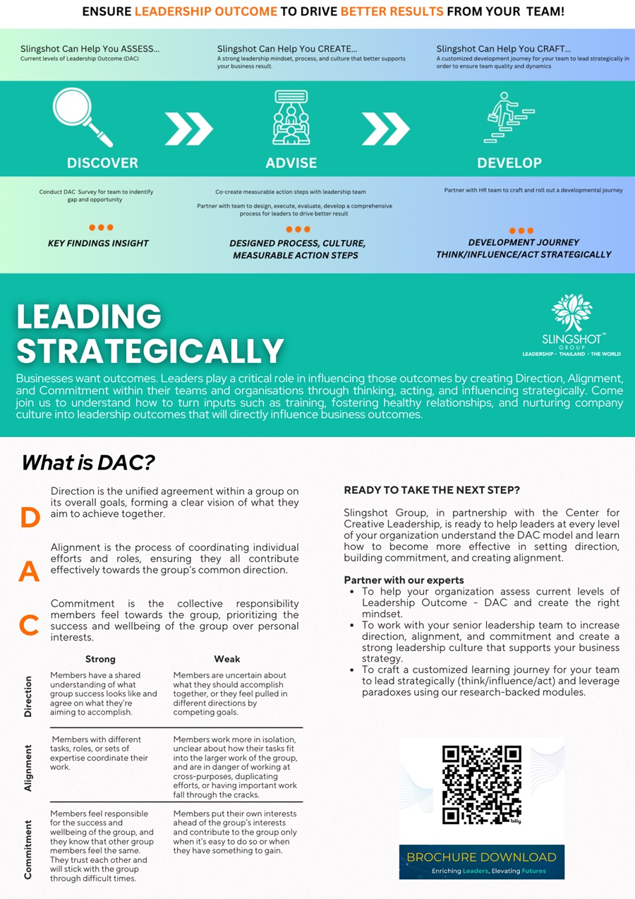 :: เมื่อพูดถึงเรื่องของธุรกิจสิ่งหนึ่งที่สำคัญคือเรื่องของผลลัพธ์ (Business Outcome) แต่หากจะทำให้เรื่องนี้เกิดขึ้นได้ ต้องทำเรื่องของ Leadership Outcome ให้เกิดขึ้นก่อน คือคนในองค์กรทุกระดับต้องมองเห็นภาพไปในทิศทางเดียวกัน DAC จึงเข้ามามีบทบาทสำคัญในส่วนนี้