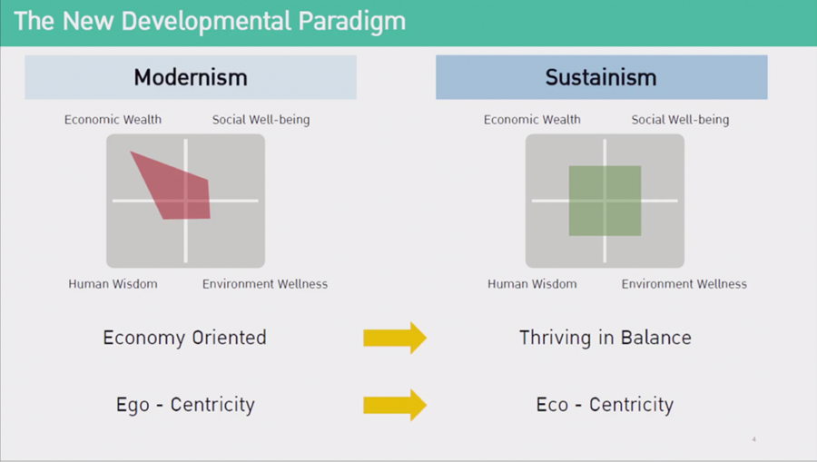 ท่านเล่าว่าโลกยุคใหม่ที่เน้นด้านความยั่งยืนต้องหันมาสร้างสมดุลของทุกส่วน 4 ด้าน